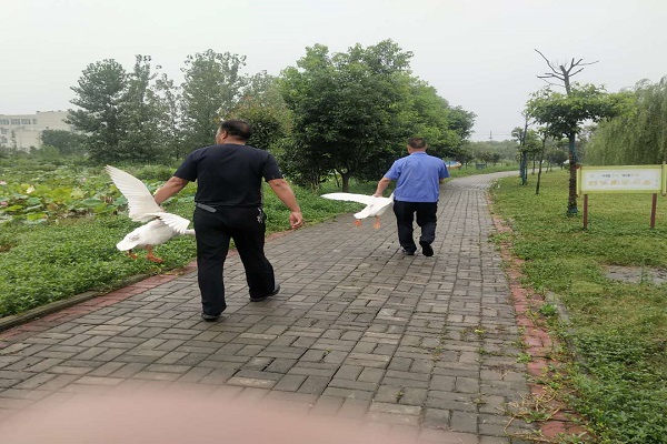 8月5日,在無為市洪巷鎮政務新區游步小道上,一抹抹藍色身影動作敏捷地揮舞著手中“兵器”,不一會就汗流浹背。據悉,是鎮城管們在驅逐散養家禽,并對一些“釘子戶”實施定點清除行動。“周邊農戶不聽勸阻執意放養家禽,衛生臟、亂、差問題突出,嚴重影響了集鎮文明形象。”,鎮城管隊長李榮貴介紹道。