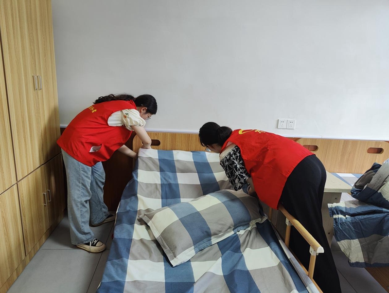 活動中,志愿者兩兩一組,有的拿起掃把打掃衛生,有的拿著抹布擦拭門窗玻璃,有的幫老人們整理床鋪,有的為老人按摩捶背剪指甲。