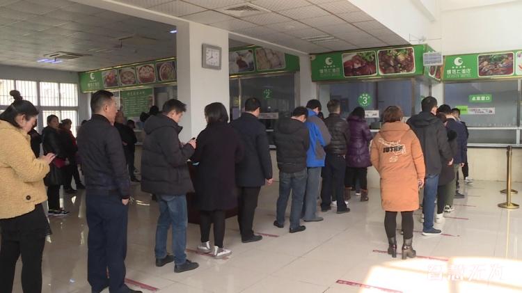 在食堂內,節約糧食宣傳畫隨處可見,餐桌上也擺放有“光盤行動”提示牌。臨近中午用餐時間,干部職工有序排隊,按需取餐,杜絕浪費。