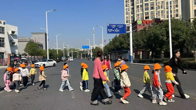 志愿者首先帶領小朋友們朗讀了通俗易懂的交通安全順口溜:路口要看信號燈,紅燈停綠燈行;一慢二看三通過,莫與車輛去搶道;不在路上玩游戲,行走應走人行道。孩子們學得既認真又開心,在學習順口溜過程中加深了對文明交通的理解。隨后,在幼兒園老師的安排下,小朋友們兩兩一組站好隊伍,帶上了鮮艷的小黃帽,手拉著手來到戶外體驗過馬路。幼兒園老師和社區志愿者有序引導小朋友們,讓他們通過親身體驗了解文明出行的重要性。