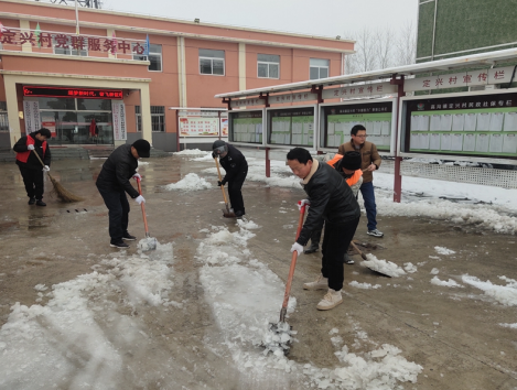圖為定興村兩委班子與志愿者一道參與掃雪除冰行動。