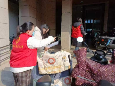 王福社區聯合共建單位在小區內向居民發放宣傳單,勸阻居民電動車莫入樓道,不私拉電線充電,加強居民安全防范意識。(王昊)
